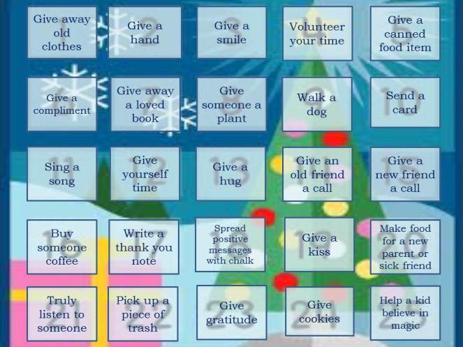 Alright, I did it; I made the Giving Advent Calendar mock-up. There are some great ideas out there for giving back for December, like this interactive one, but I really wanted to focus on ways we could give back for free or low cost. That said, this is a super simple one I made up using Word, so I would love to see what other people have come up with for Giving Advent Calendars, both content and design.