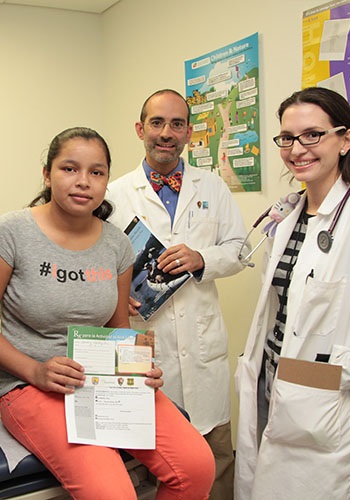 Dr. Maria Cristi Rueda and Dr. Robert Zarr with a young patient holding a copy of her park prescription / HealthIT Buzz