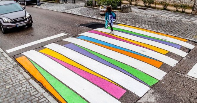 Bulgarian artist Christo Guelov is turning crossings in Madrid into colorful pieces of art as part of his project called Funnycross. Using striking colors and geometric designs, Guelov breathes life into otherwise stale public installations. “Funnycross uses zebra crossings to intervene in the urban landscape,” writes the artist. “The metaphor “A bridge between two shores” is the starting point of this artistic intervention.”
