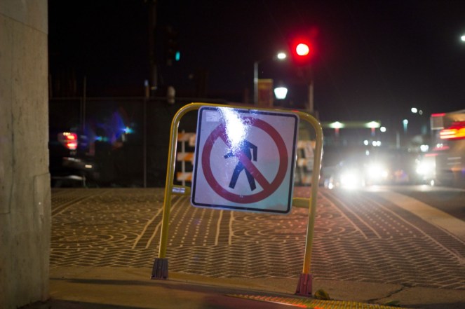 Let’s talk about how Los Angeles is a city where construction projects can fence off whole blocks, including the sidewalks, without offering people on foot an alternative. Let’s talk about how when that happens, no one even considers converting one of the two car lanes into a temporary sidewalk, because dear god, that might cause slight inconvenience to people in cars. And let’s talk about how ironic it is that inconveniencing people in cars is the end of the world, but doing the same to people on foot is a non-issue. Then let’s talk about how when frustrated walkers decide to use the car lane rather than take the ridiculous detour, the city’s totally acceptable solution to that problem is not to concede space to those people, but rather to bolt permanent, metal signs into the middle of the sidewalk to keep them from doing so. That is cancer.